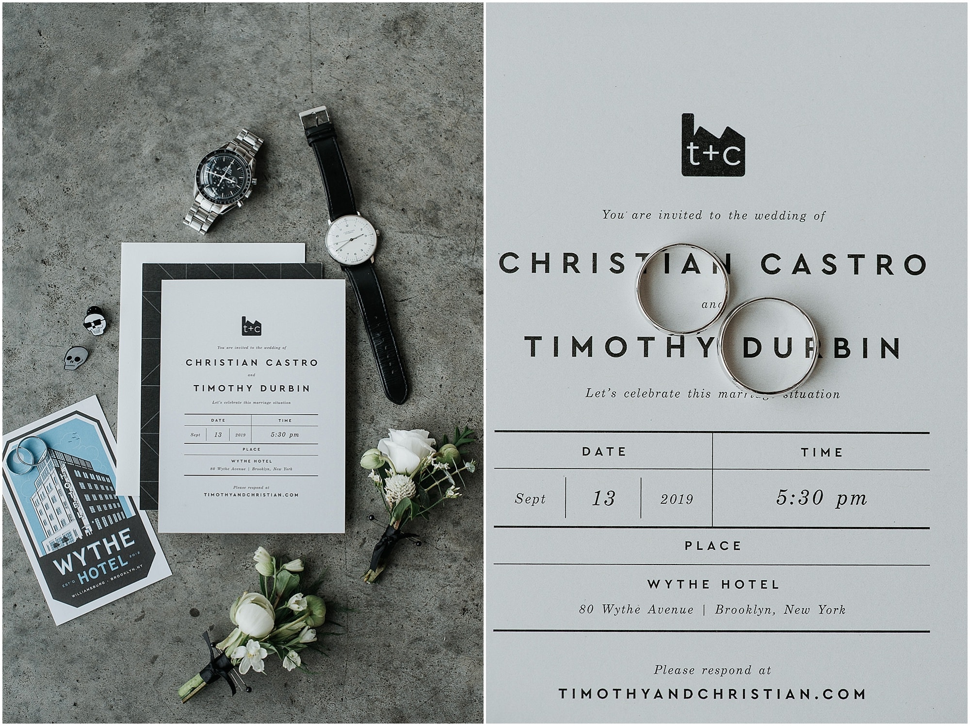 Planning: Electric Celebrations Venue: Wythe Hotel Christian Tux: Indochino Timothy Tux: Suit Supply Invites: Paper Culture Flowers: Sprout Home DJ: DJ Vida Drag Performance: Kandy Muse, Janelle no. 5, Dahlia Sin